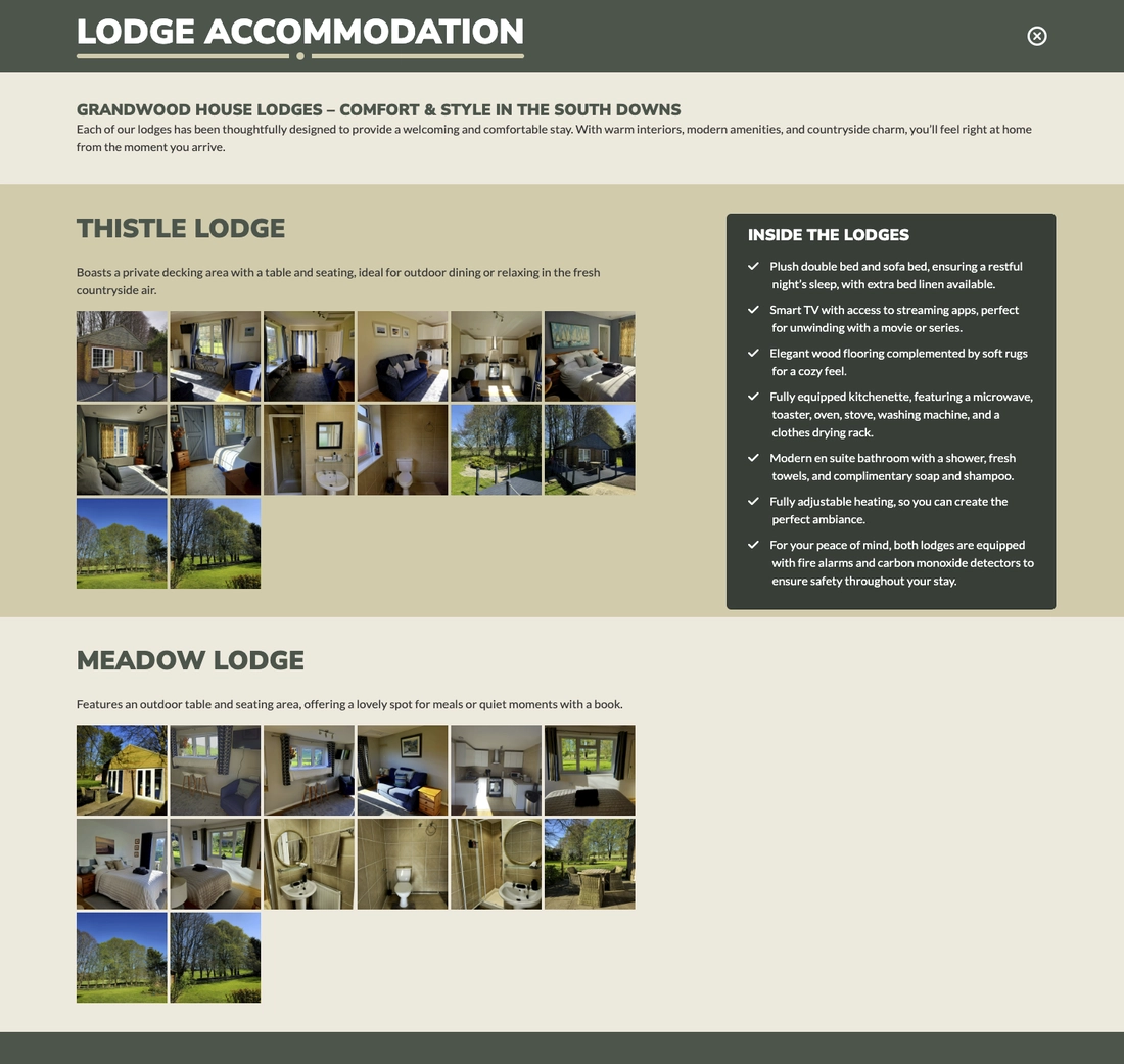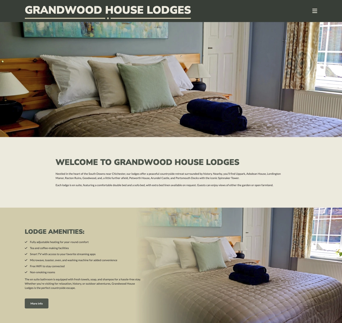 Grandwood House Lodges commissioned a new website to enhance the promotion of their recently refurbished holiday lodges. I developed a clean, sophisticated design featuring a neutral colour palette complemented by striking imagery to effectively showcase their offerings.