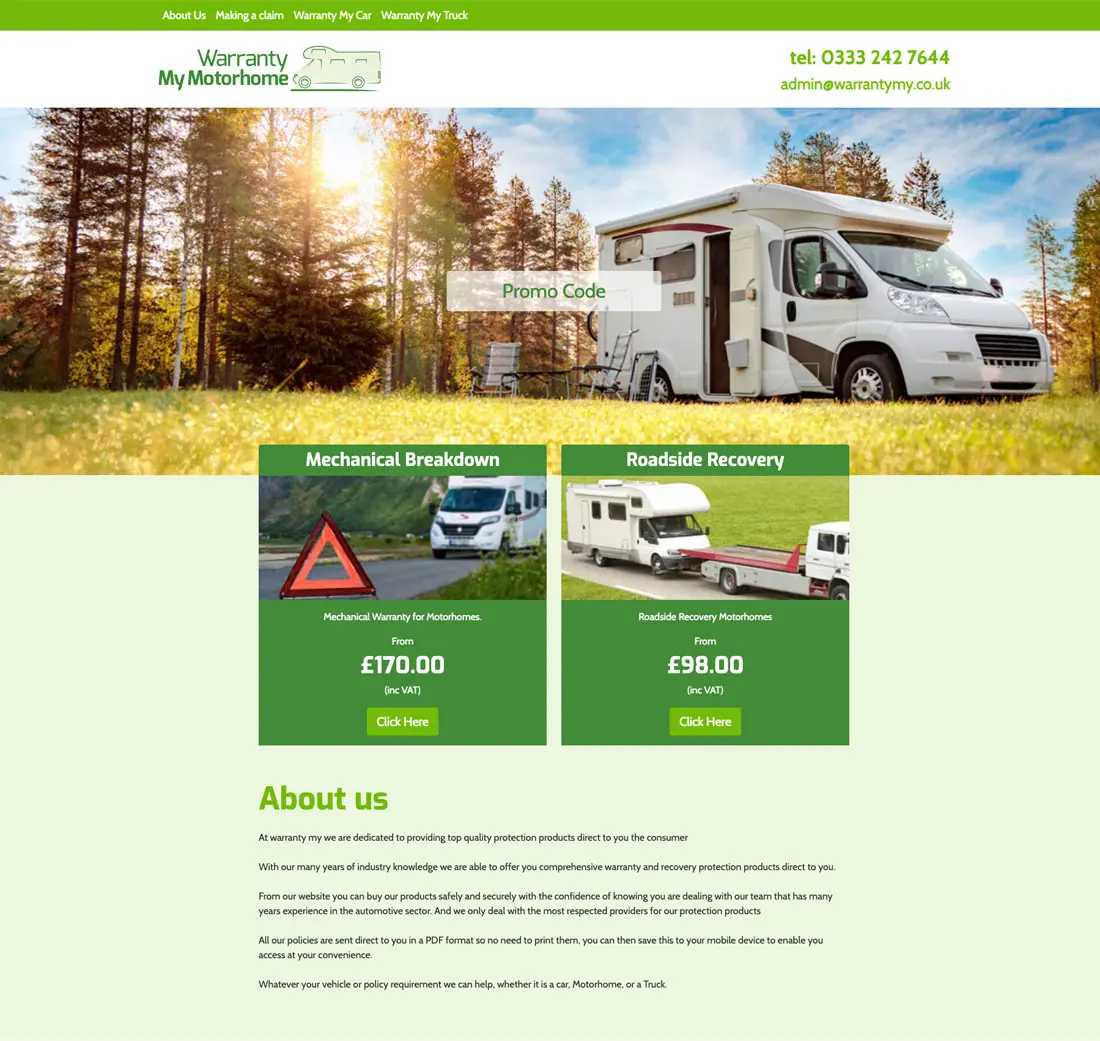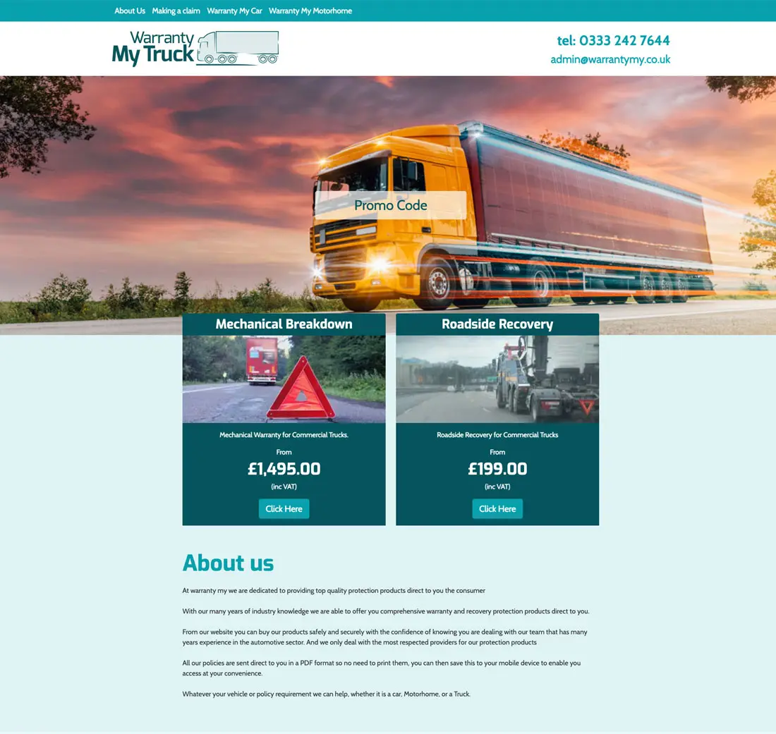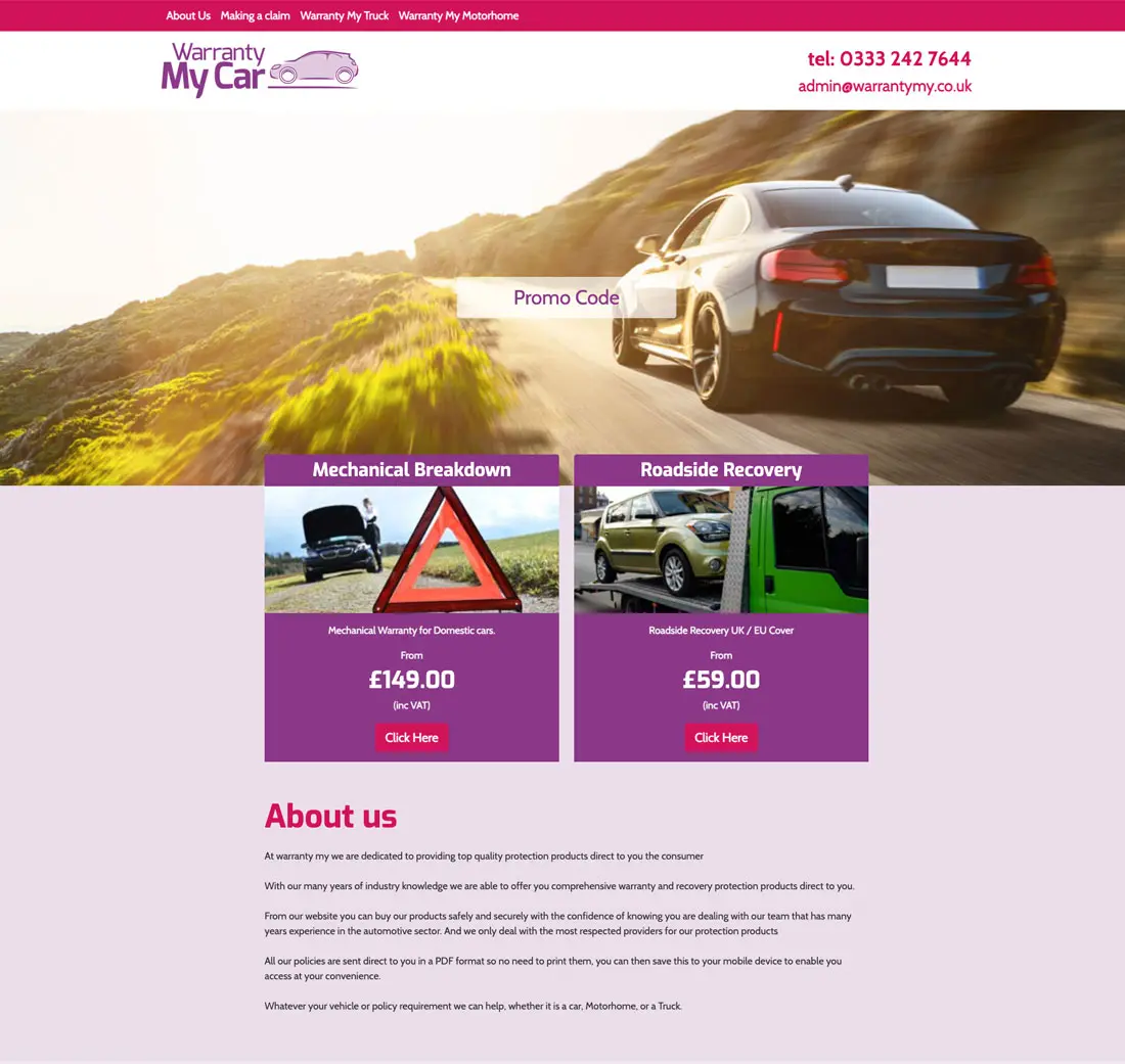 I designed and developed an intuitive, user-friendly website for Warranty My, a platform dedicated to the purchase of vehicle breakdown and recovery policies. The website features three distinct sections—car, motorhome, and truck—each distinguished by unique colour schemes to enhance user navigation.