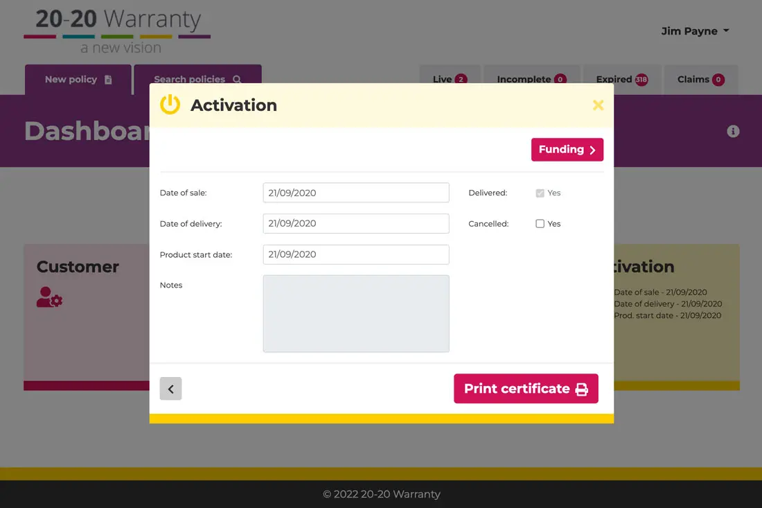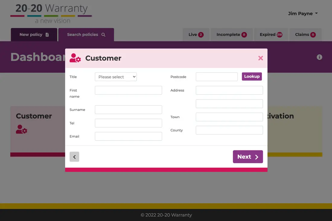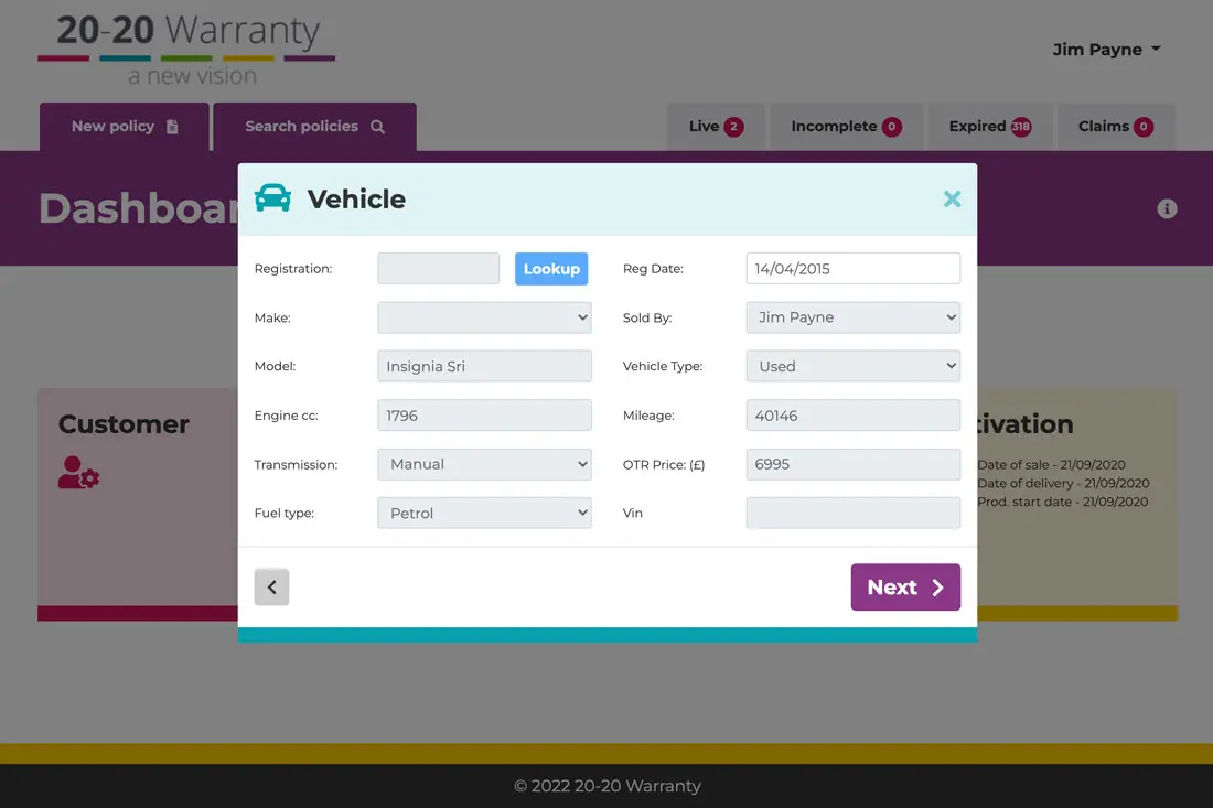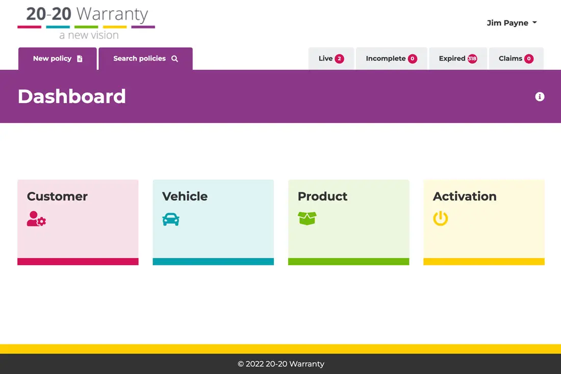 Incorporating 20-20 Warranty's bold colour scheme, the system features four distinct sections — Customer, Vehicle, Products, and Activation — each represented by a unique colour from their branding palette. These sections are presented as modals, allowing users to seamlessly navigate from one to the next.