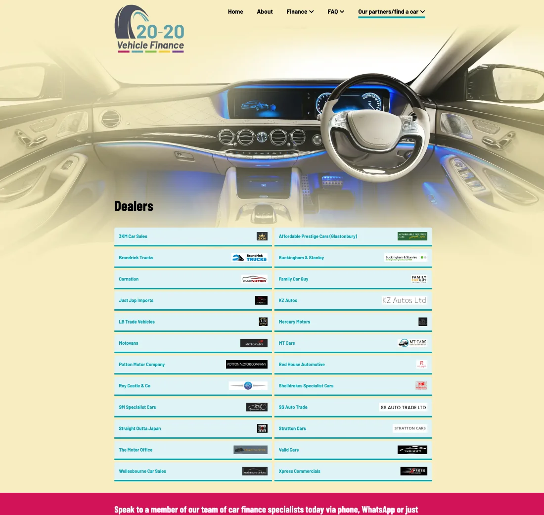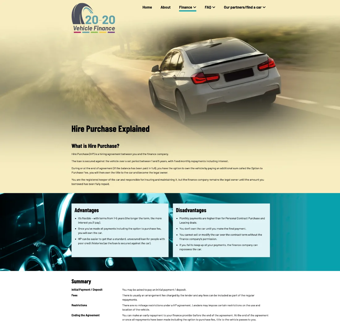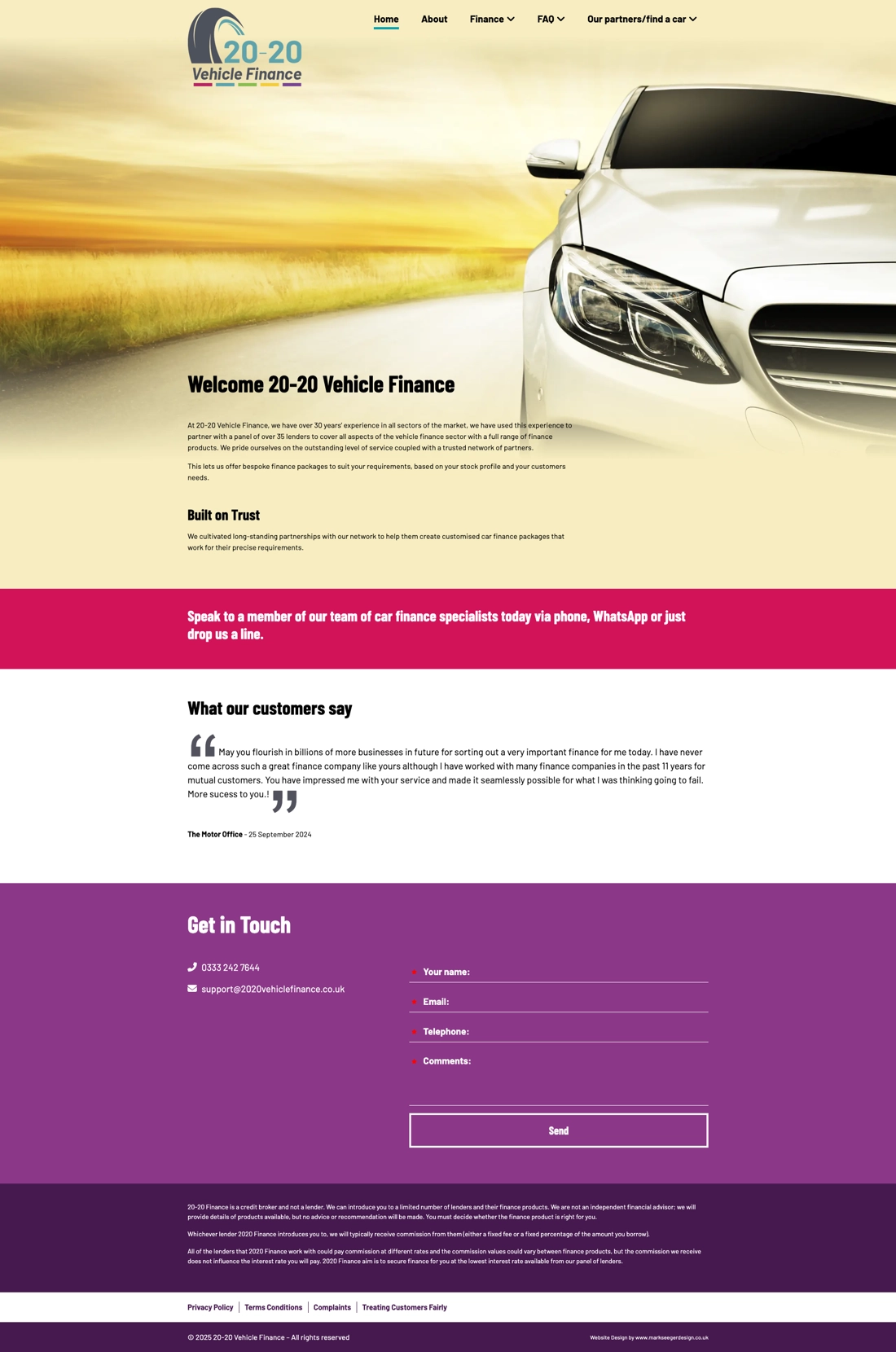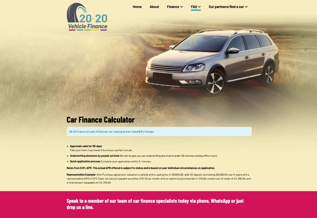During my tenure with 20-20 Warranty, I had the privilege of contributing to the development of their new vehicle finance website. I employed bold imagery to create a modern and visually appealing design, ensuring brand consistency by incorporating the company's established colour palette. Given that this project pertained to a different sector of their business, I was also tasked with designing a new logo. This logo was thoughtfully adapted from their existing warranty logo to maintain a cohesive brand identity while effectively representing the new service.